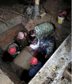 該段水泥管屬于主城區(qū)老舊管網(wǎng),管道周圍環(huán)境復雜,布有國防光纜、天然氣管道等重要設(shè)施,不能動用大型機械,只能通過人工及簡易工具開挖。時間緊,任務重,為爭取搶修時間,搶修人員一邊現(xiàn)場制訂維修方案,一邊聯(lián)系準備各種配件和維修材料。為將對用戶的影響降至最小范圍,水廠實行減壓供水,待開挖和搶修材料一切準備就緒后,搶修人員實行帶水作業(yè),先給套管預留一個DN50鋼管作為導流口,待水泥頭子徹底凝固后再關(guān)閉導流口。封堵水泥頭子時,噴涌而出的水流濕透了搶修人員的衣服,速干水泥灼傷了他們的皮膚,但他們沒有一絲退縮,仍爭分奪秒地在水坑中忙碌著搶修工作。