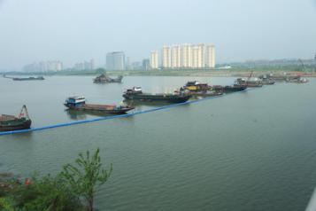 4月10日上午10點(diǎn),13艘作業(yè)船分布在供水管道的各個(gè)吊點(diǎn),開(kāi)始進(jìn)行注水沉管作業(yè)。為控制管道的水量流速,每注水一次10分鐘,暫停約15分鐘。施工方根據(jù)管道和每個(gè)吊點(diǎn)的受力情況,從南岸往北岸注水,船上每一個(gè)吊點(diǎn)根據(jù)水量調(diào)節(jié)逐漸下沉。由于河床差異,鋼管需要沉入水下十幾米,對(duì)施工技術(shù)要求很高,整個(gè)過(guò)程持續(xù)了六個(gè)小時(shí)。