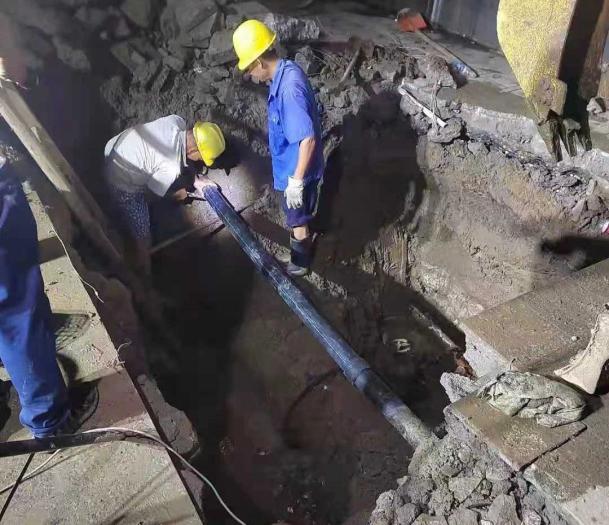 DN600管徑是襄城輸配水主管線,炎熱夏季正值用水高峰,閘門一旦關停就會造成大面積用戶停水。由于該地段有3個不同高度的地平面,而漏點又在停車場內(nèi),地形錯綜復雜不利于大型設備開挖。亢亦軍等沒有等待,與商都負責人郭洪取得聯(lián)系一起協(xié)調(diào)車輛疏散,核實最佳地點開挖面積長15*2米,于晚22:15用水峰值下來后立即停水維修DN600開口夾板,于15日0:15分完成搶修開水,2:00完成回填維修完畢。